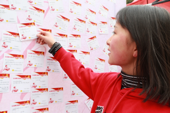 在“‘爱•尚’微公益”实践项目现场,志愿者组织了服务成果交流活动,展示了青年志愿者在扶贫助困、助残养老、支农支教、环境保护及关爱留守儿童等方面的生动影像。大家在“雷锋经典语录”学习承诺墙上粘贴寄语,表示将继续弘扬雷锋精神,积极践行社会主义核心价值观,将传播社会正能量的承诺落到实处。