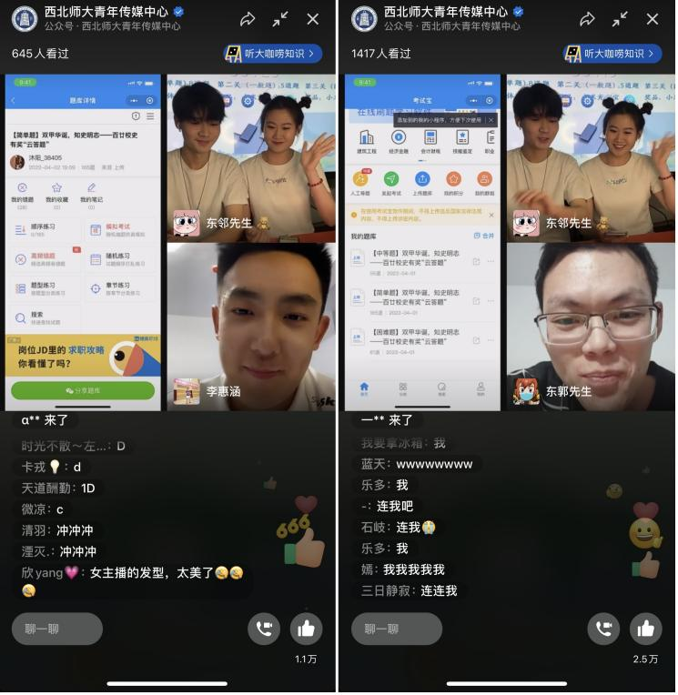 在全校众志成城抗击疫情,校园封闭管理期间,通过网络直播方式开展的百廿校史“云答题”活动得到了同学们的热切关注与积极参与。在连续5天的直播活动中,共有9600余名学生在线观看,同学们纷纷通过网络连麦的方式,与设在兰天学生公寓直播间的主播们一起学校史、赢奖品。“在线闯关答题学校史的方式特别新颖,我和舍友每天都守候在屏幕端观看大家闯关答题,我们也学习到了很多校情校史知识。我们将不断深入学习西北师大120年来筚路蓝缕、艰苦创业的历史,在学习校史中做到知史爱校、知史明志。”文学院2019级汉语言文学专业何楠说。