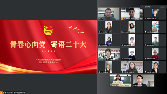青春逢盛会,奋斗正当时。连日来,西北师大各级共青团组织和全体团干部、“青马工程”培训班学员、学生骨干、研究生支教团志愿者、广大团员青年按照学校疫情防控要求,通过开展“青春心向党 寄语二十大”主题团日活动,在校园内迅速掀起学习党的二十大报告热潮。大家纷纷表示,报告鼓舞人心、催人奋进,青年学子将坚定不移听党话、跟党走,争做有理想、敢担当、能吃苦、肯奋斗的新时代青年,为全面建设社会主义现代化国家贡献青春力量。