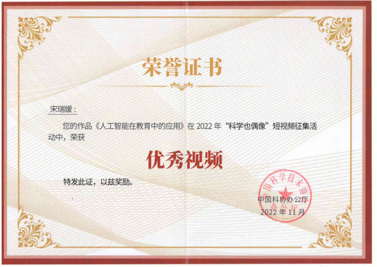 “科学也偶像”短视频征集活动由中国科协联合教育部、共青团中央、中国科学院、中国工程院主办,旨在以短视频形式弘扬科学家精神,展现真实科技工作者形象,对科学知识进行科普宣传。据了解,本次活动共征集到上千个视频作品,最终评出86项获奖作品,包括1个一等奖、3个二等奖、10个三等奖、30个优秀奖和36个入围奖等。宋瑞媛同学的视频作品《人工智能在教育中的应用》将学科专业和科学普及相结合,科普人工智能技术在教育中的应用,让更多人感受智能教育发展新方向。